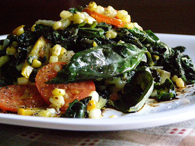 Sautee of swiss chard, lots of whole basil leaves,fresh corn, zucchinis and cherry tomatoes